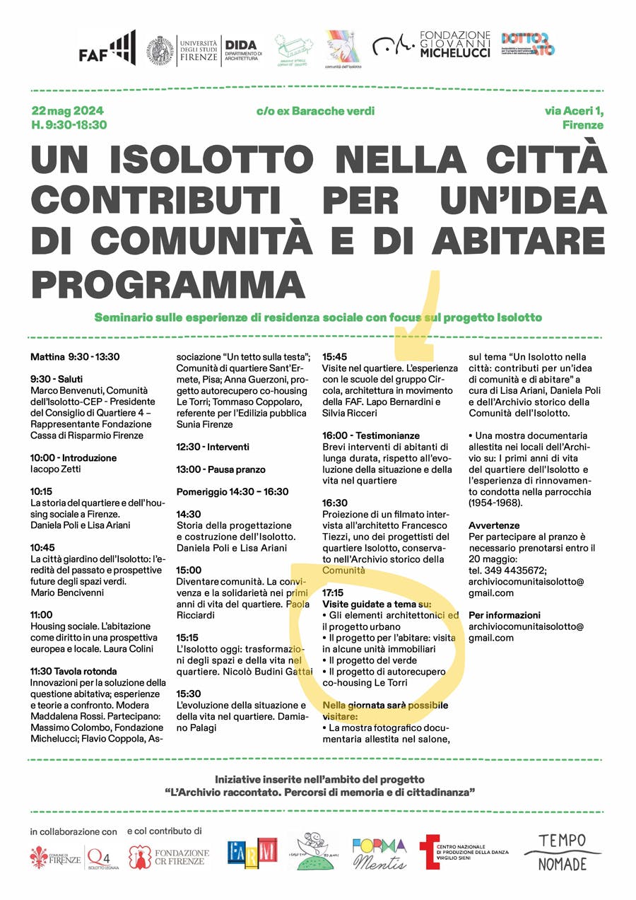 Il seminario, a cura della Comunità dell’Isolotto e il CEP Odv in collaborazione con la Scuola di Architettura dell’Università di Firenze, Fondazione Michelucci e Fondazione Architetti Firenze e altri esperti e architetti – si inserisce nell’ambito del progetto “L’archivio raccontato. Percorsi di memoria e cittadinanza” e della settimana (18 -25 maggio 2024) in cui sarà possibile visitare la mostra fotografico documentaria dal titolo “Un Isolotto nella città: contributi per un’idea di comunità e di abitare” (vd. allegato).